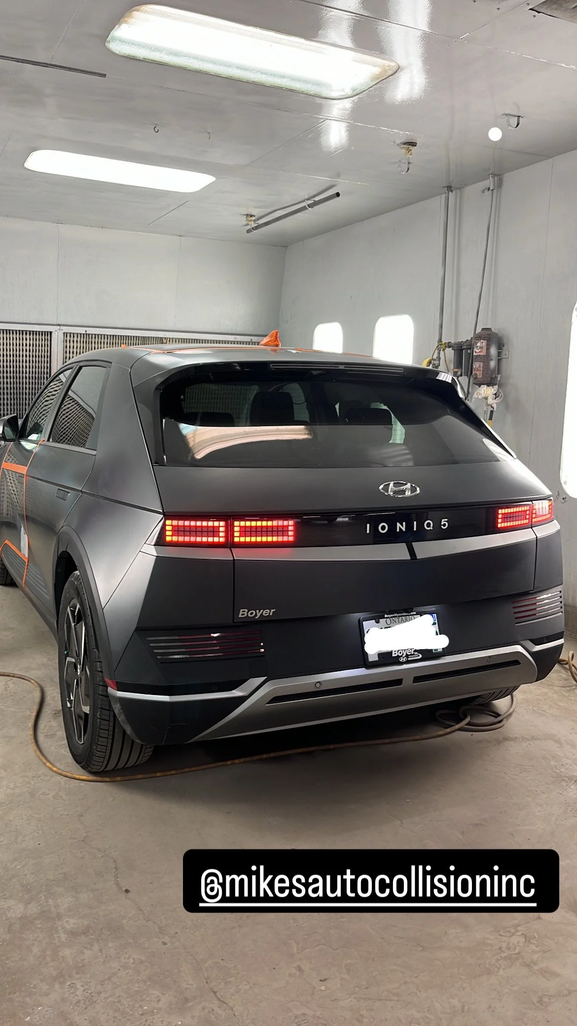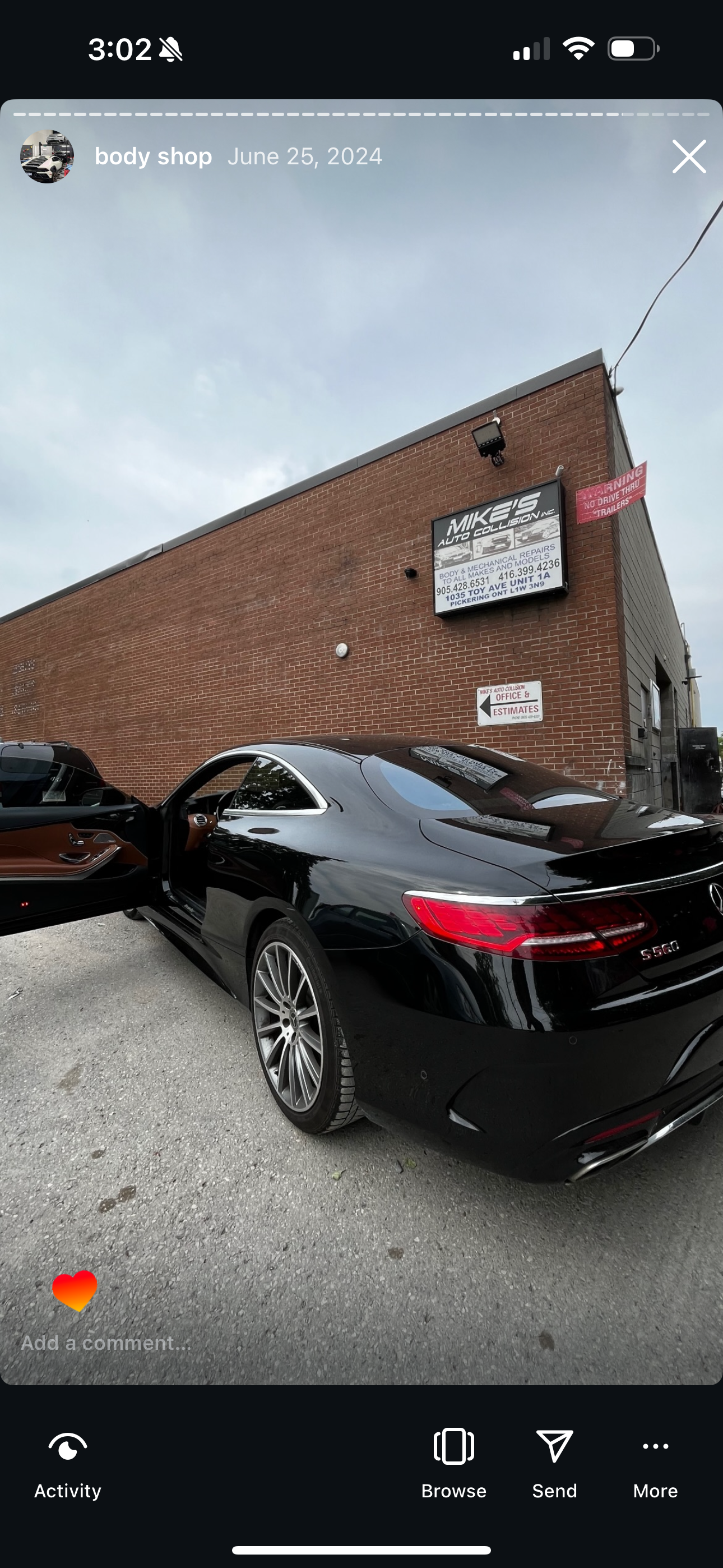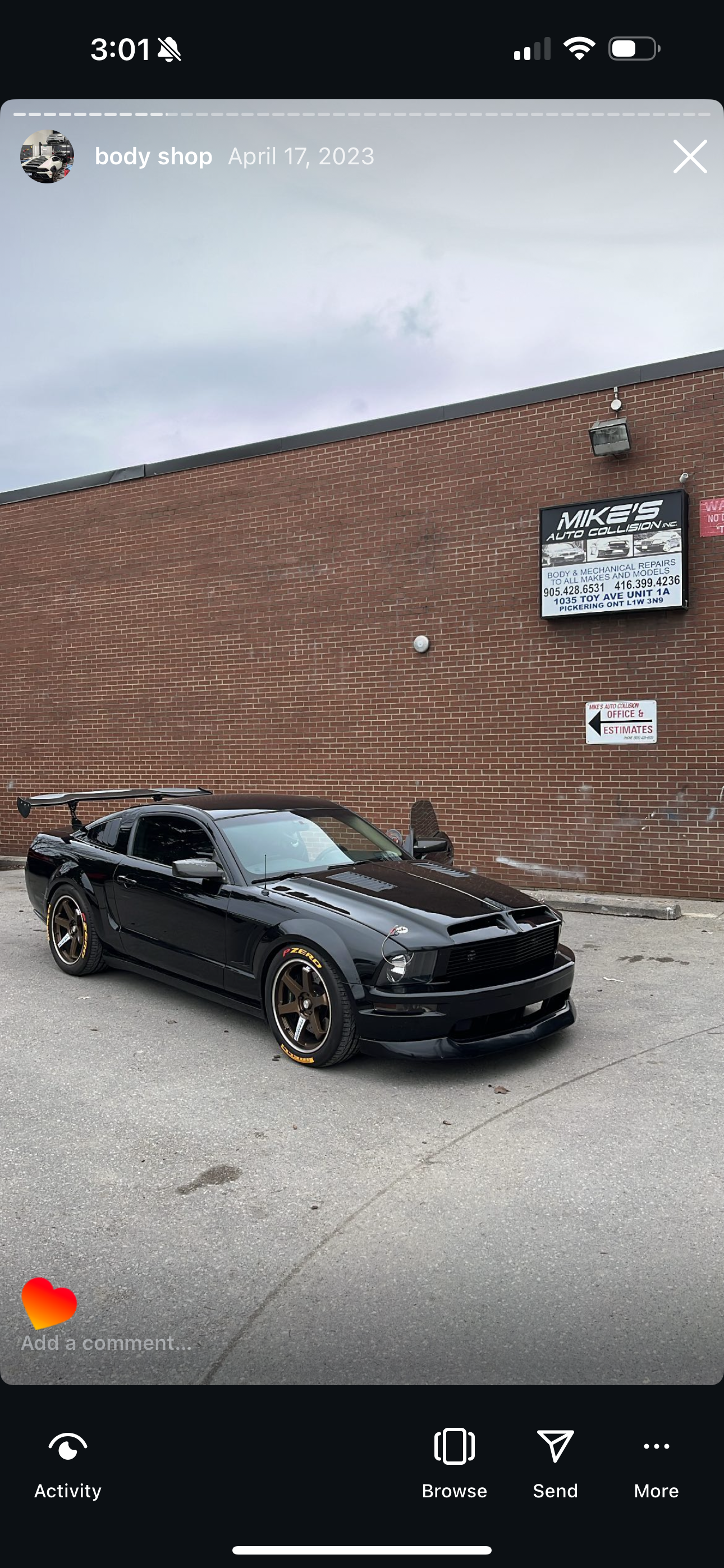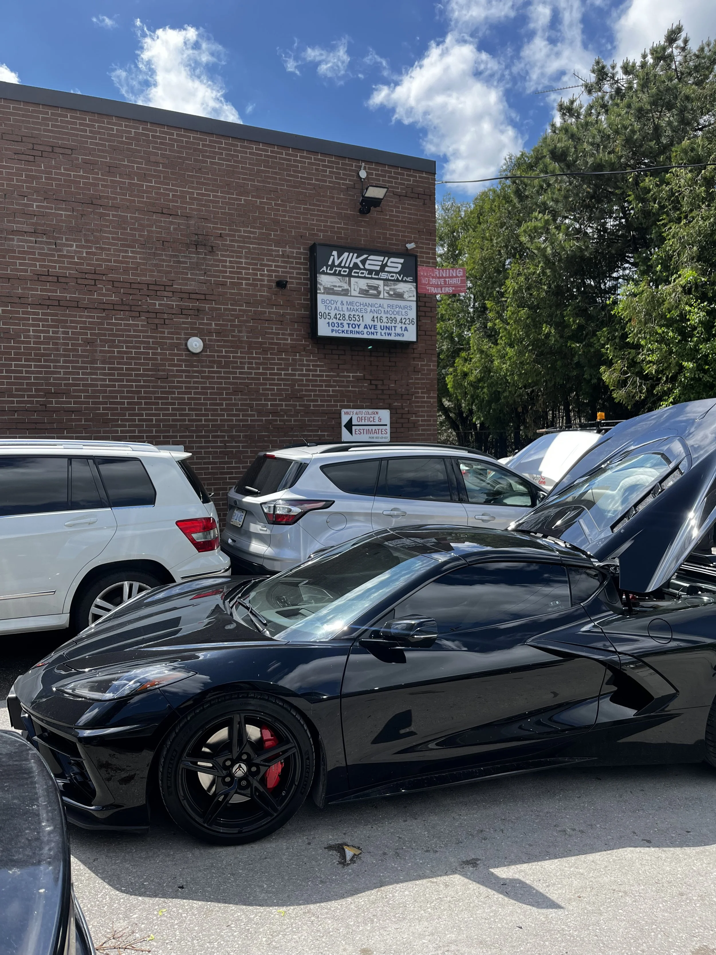 Black sports car with a large rear wing, parked outside a brick building with signs for Mike's Auto Collision, a body and mechanical repair shop, on April 17, 2023