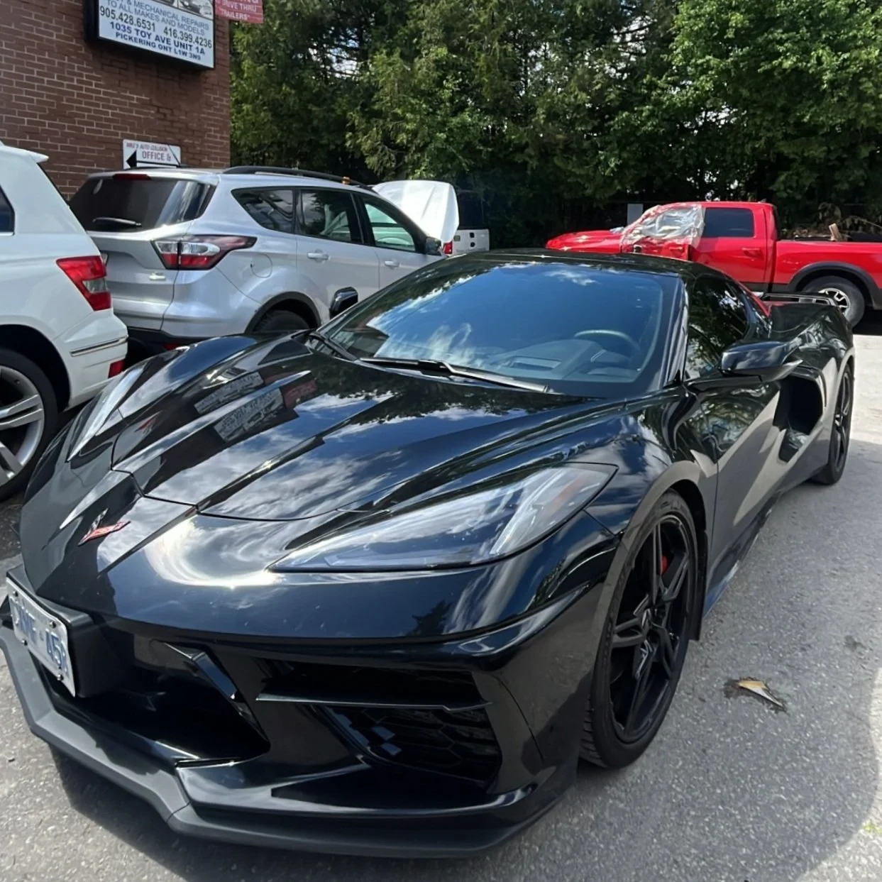 A black sports car, a Chevrolet Corvette, parked in a lot among other vehicles including a white SUV, a gray SUV with its hood open, and a red pickup truck with some plastic on the window, with trees and a brick building in the background.