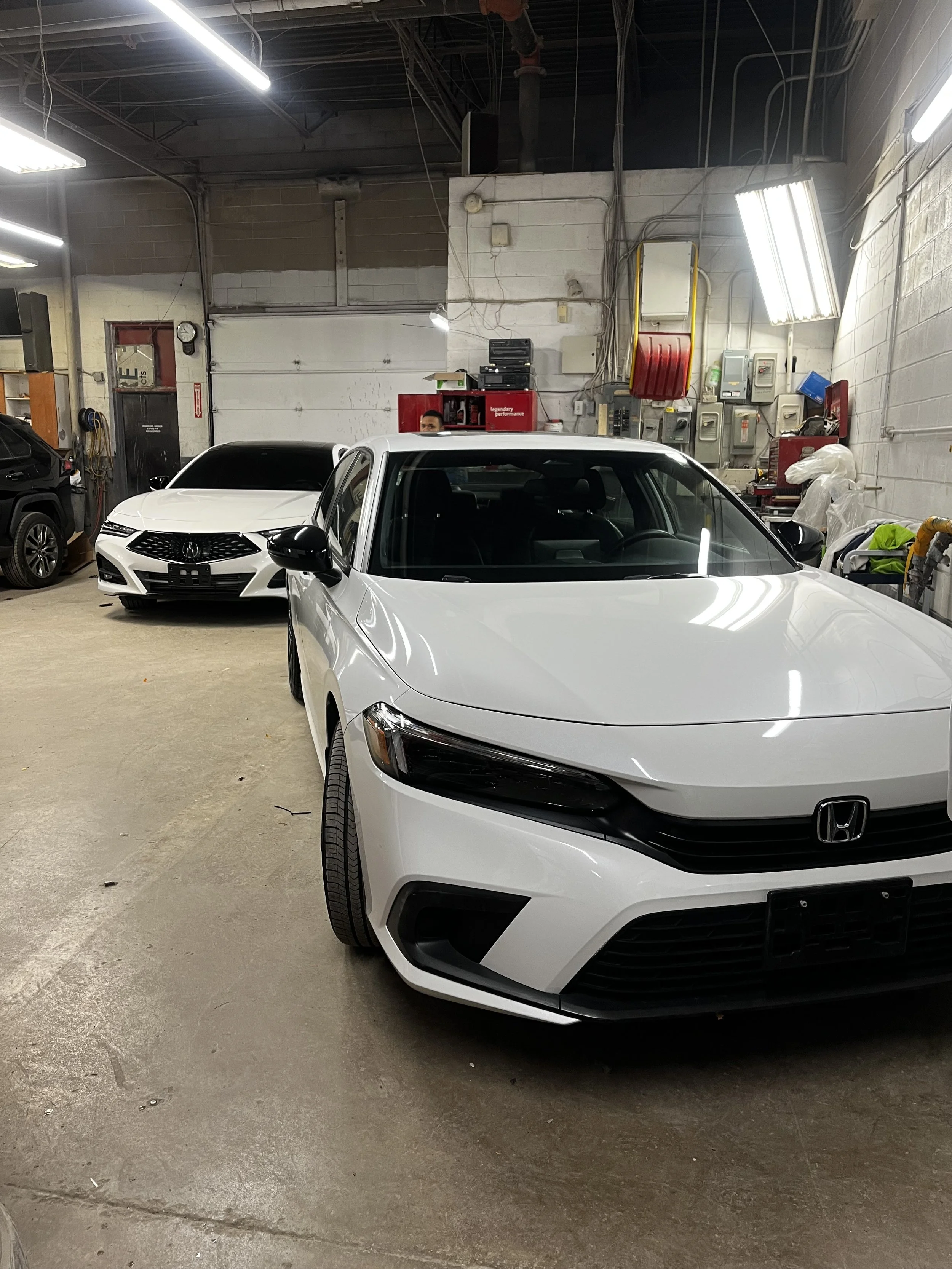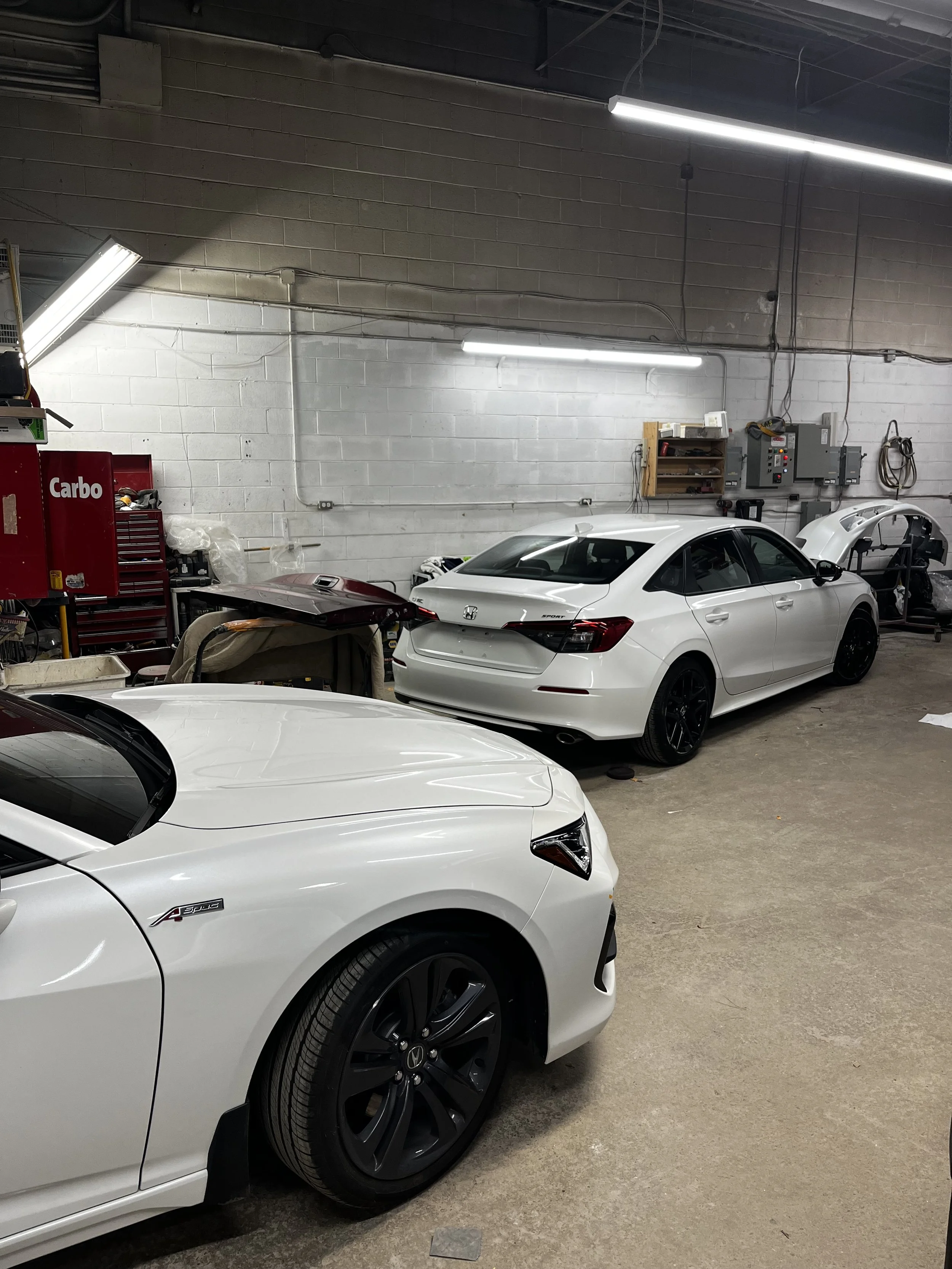 Two white Honda cars parked inside a garage with work tools and equipment in the background.