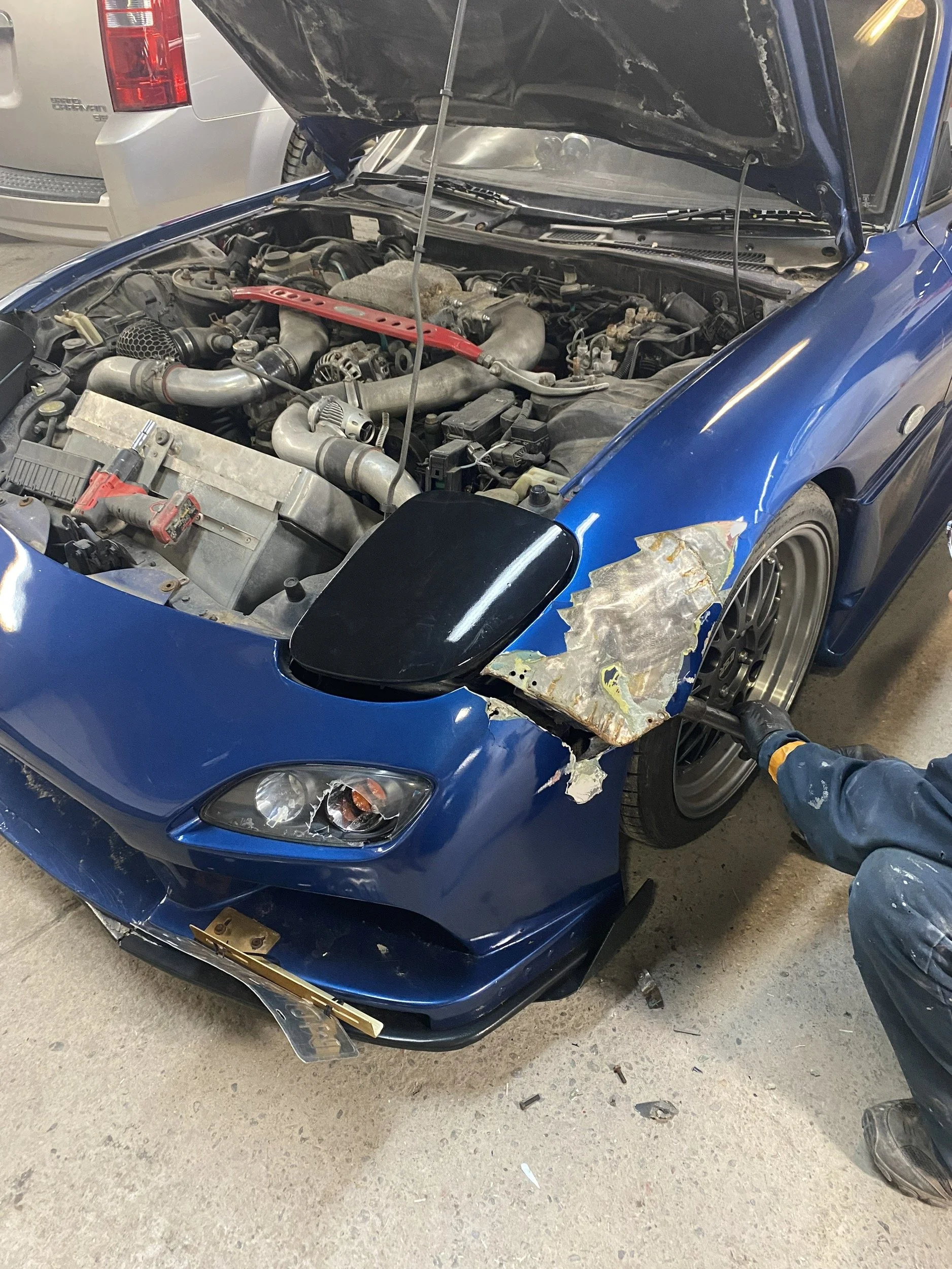 Man repairing a blue sports car with visible damage to the front fender in a garage, with the hood open revealing the engine.