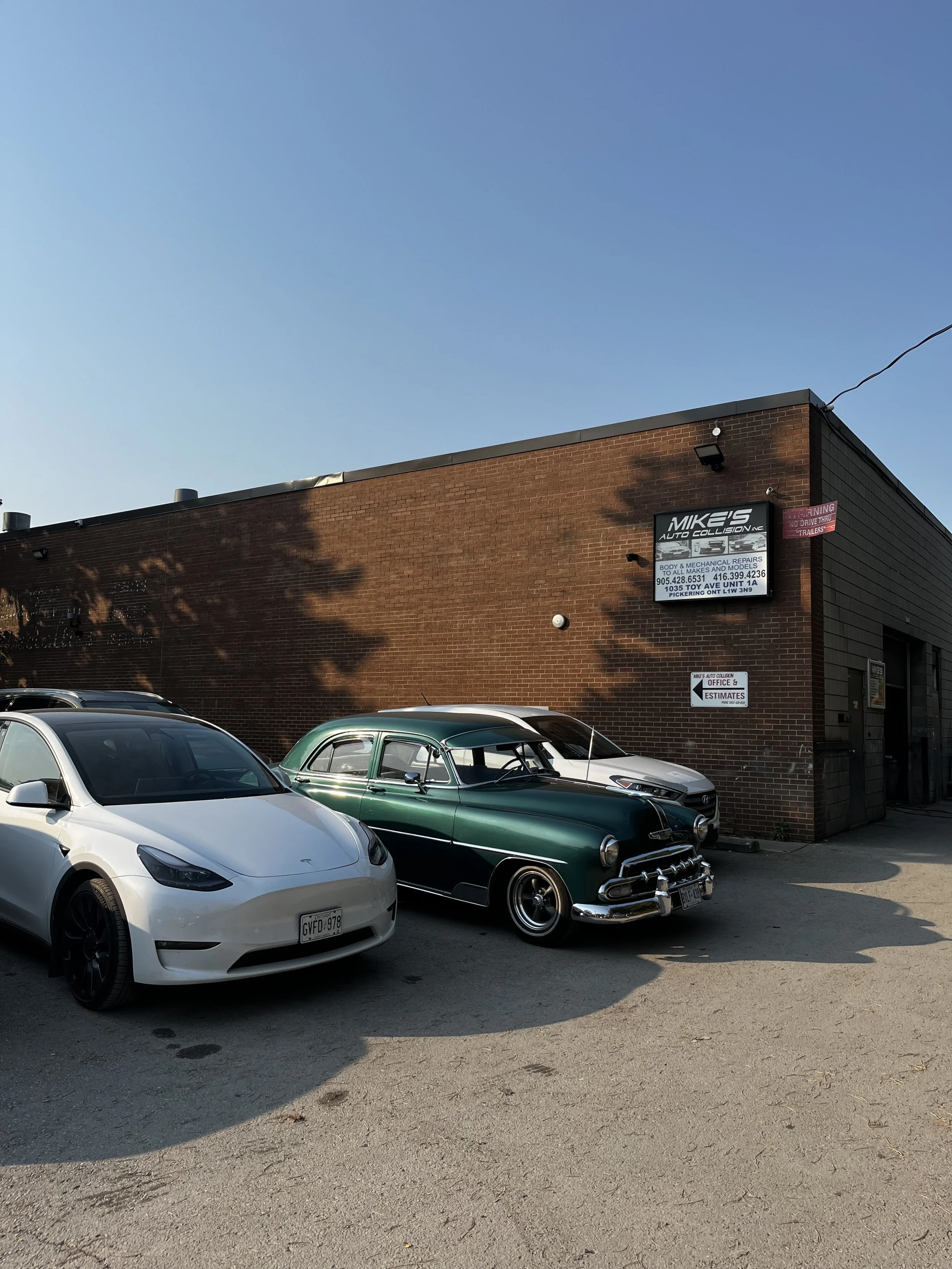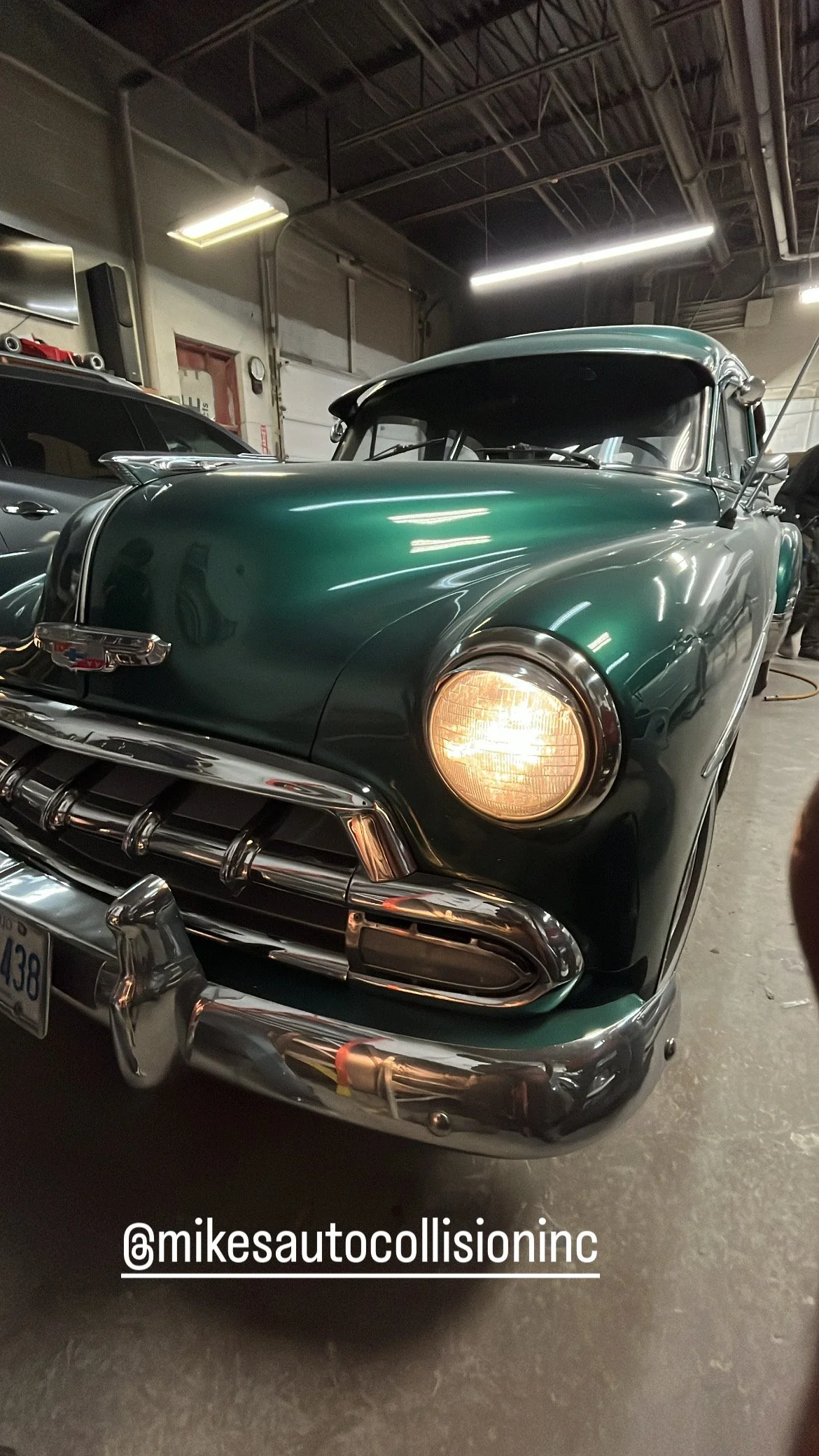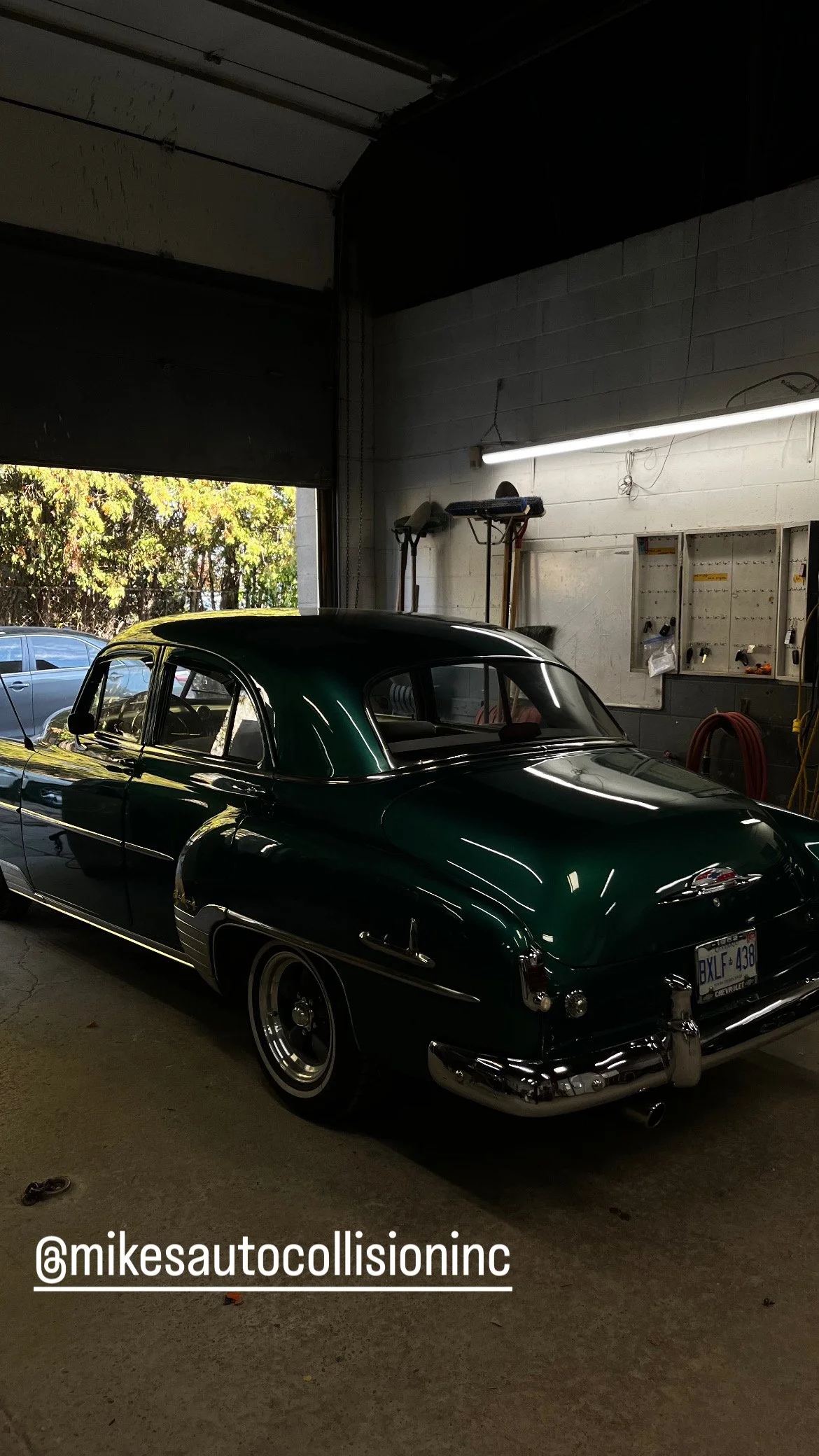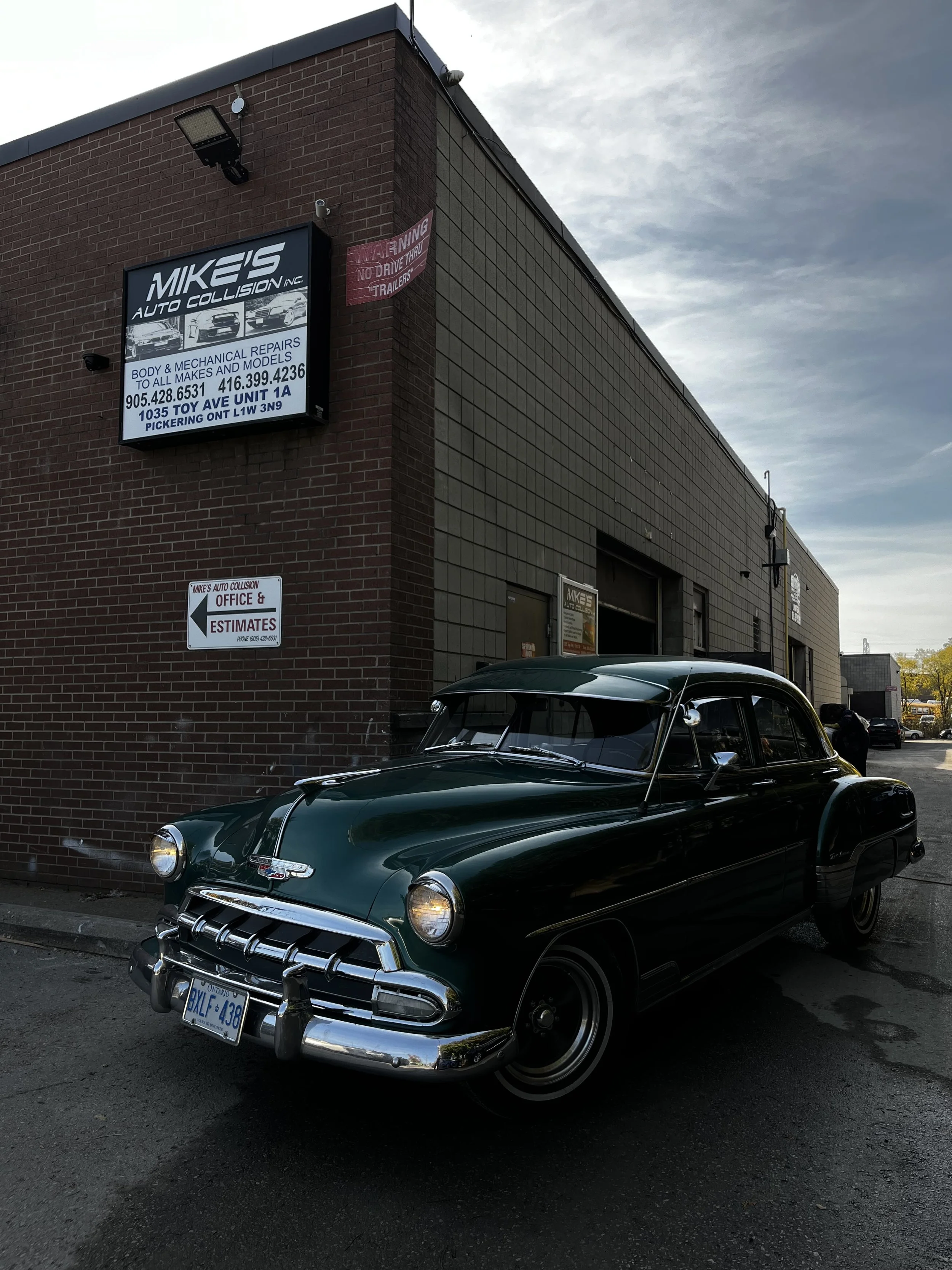 A vintage green car parked outside a brick auto repair shop with a sign reading 'Mike's Auto Collision' and a cloudy sky in the background.