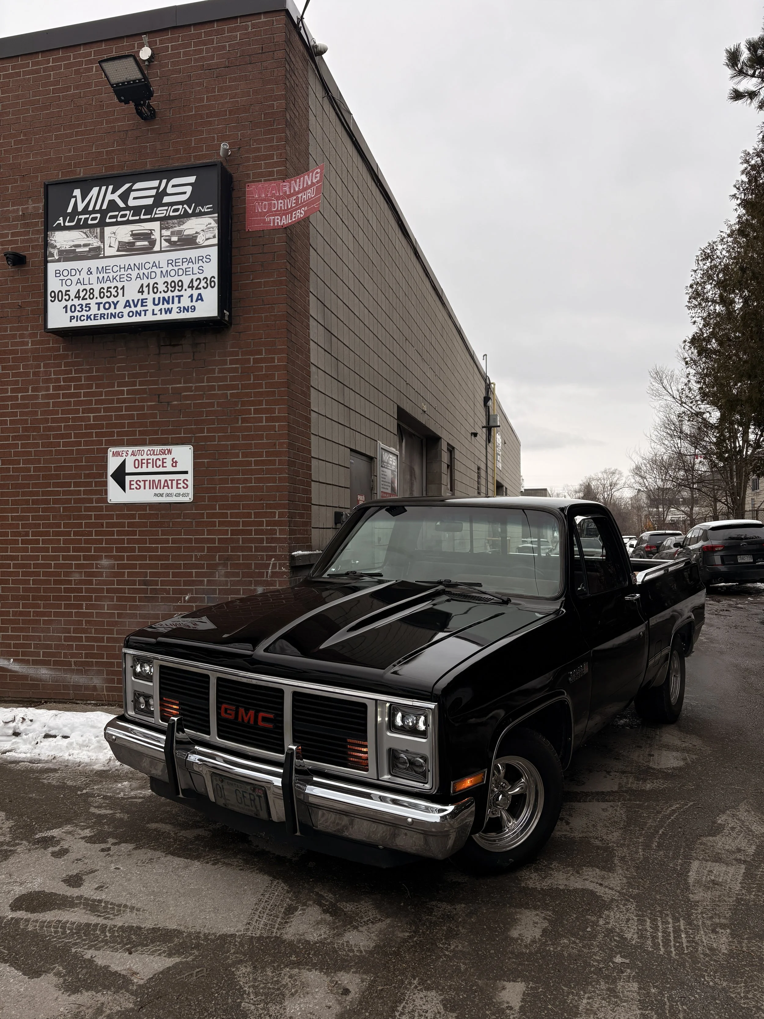 A black GMC pickup truck parked outside an auto collision repair shop on a cloudy day, with snow on the ground.