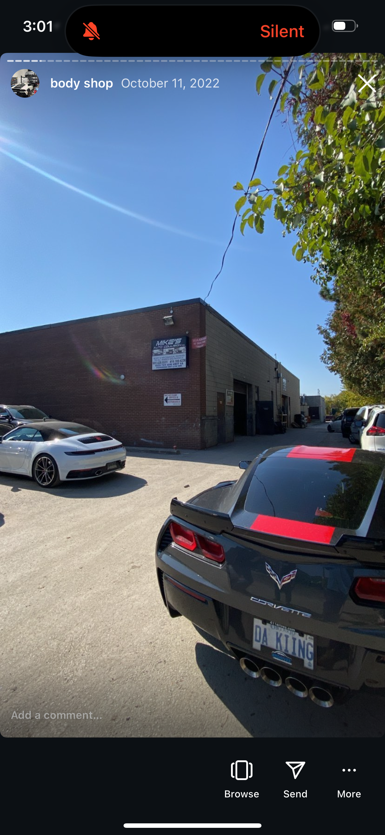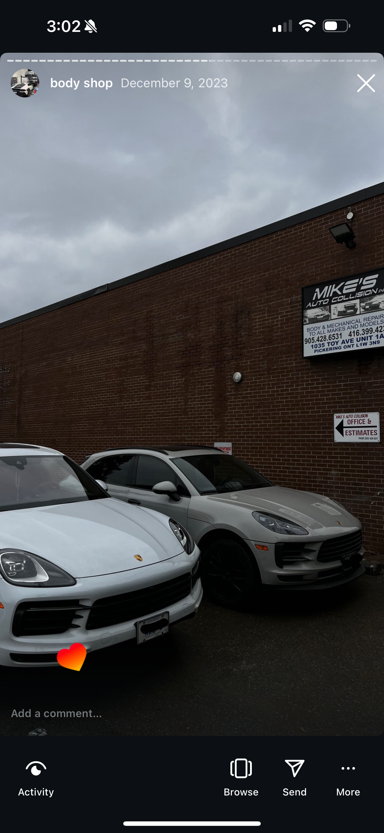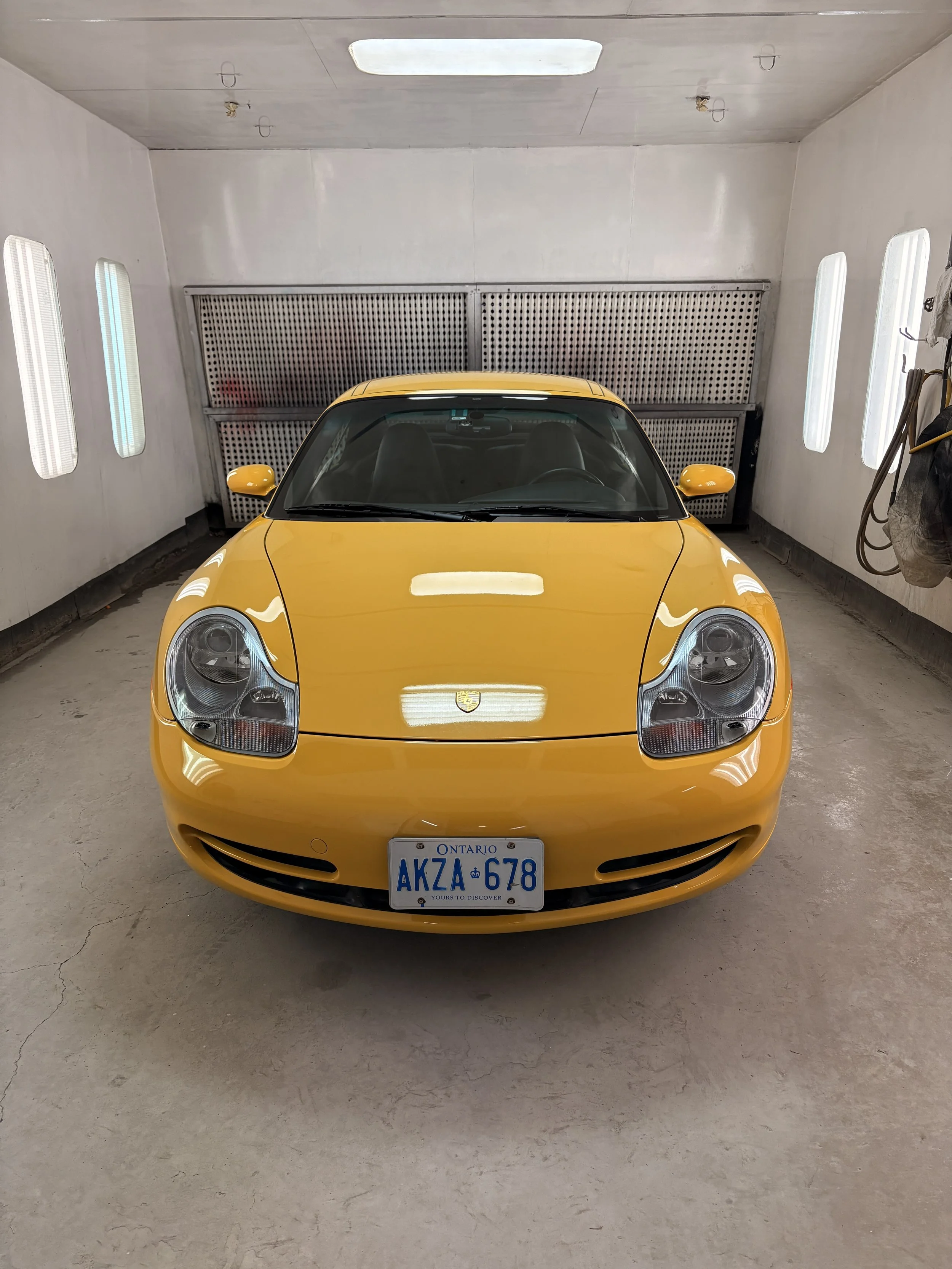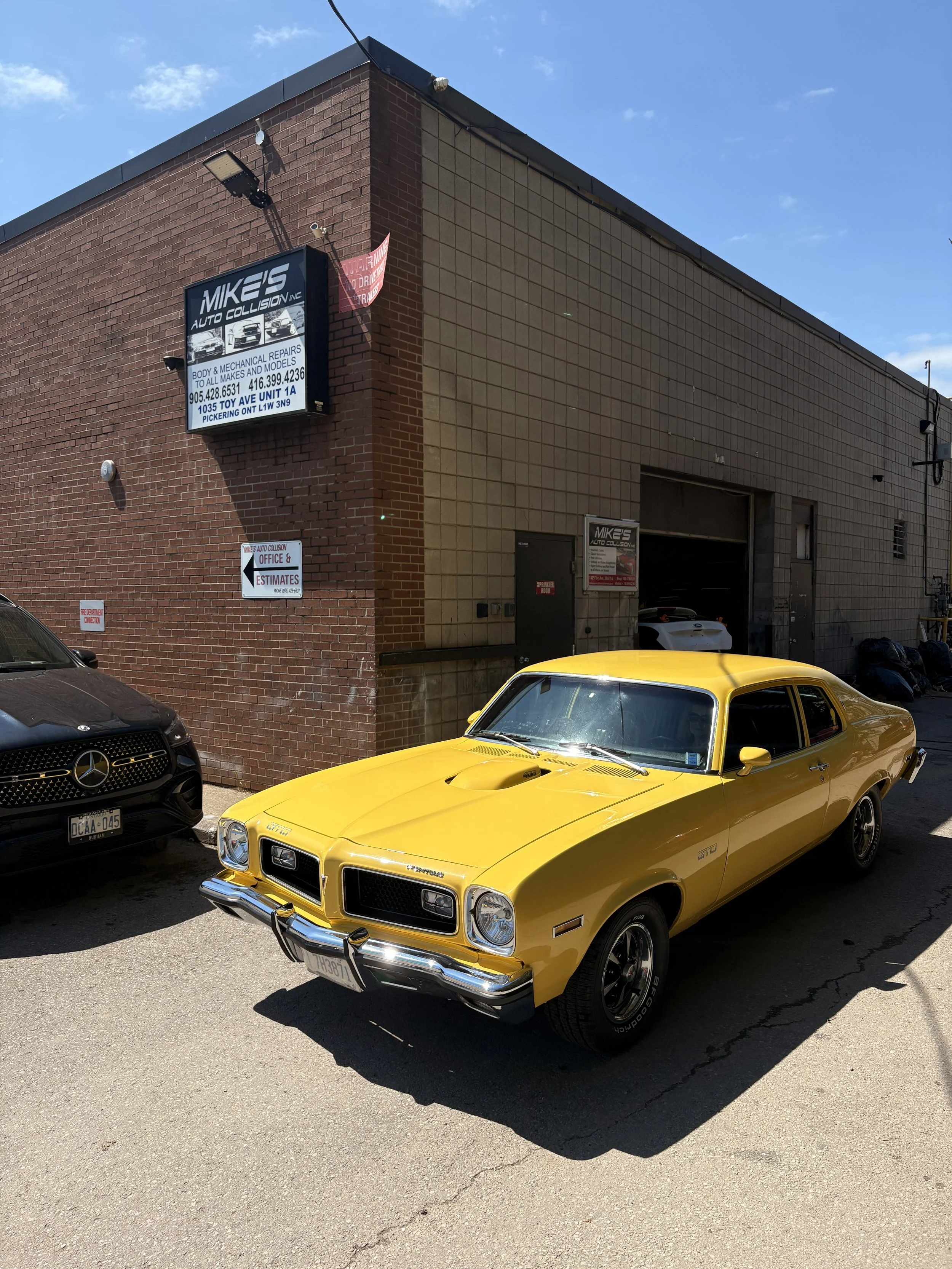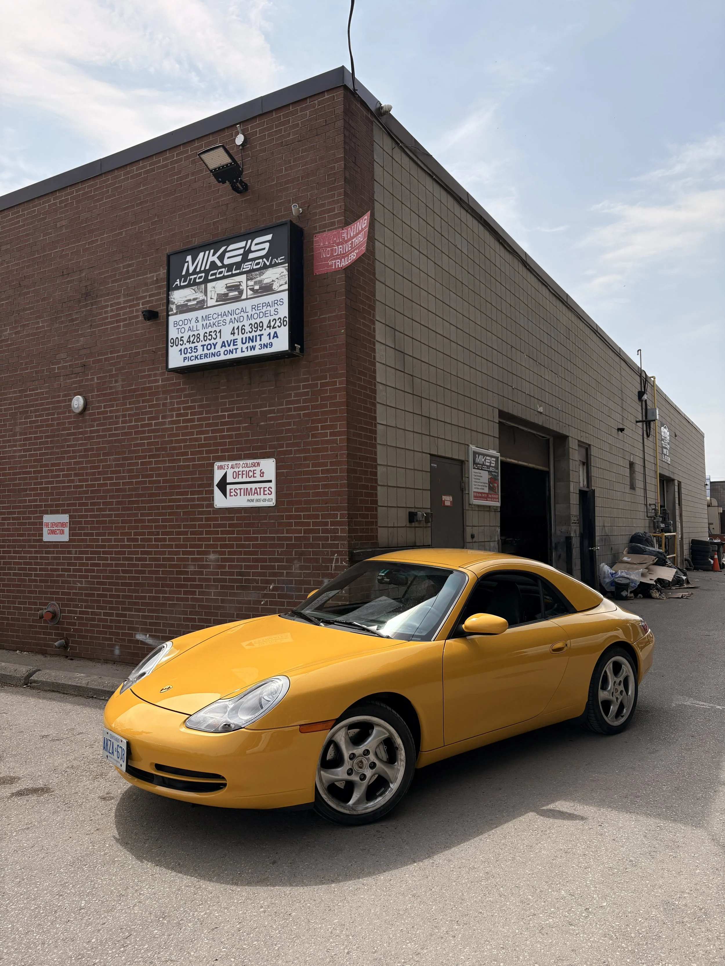 A yellow Porsche sports car parked outside Mike's Auto Collision, a brick industrial building with signage for auto repair in the background.