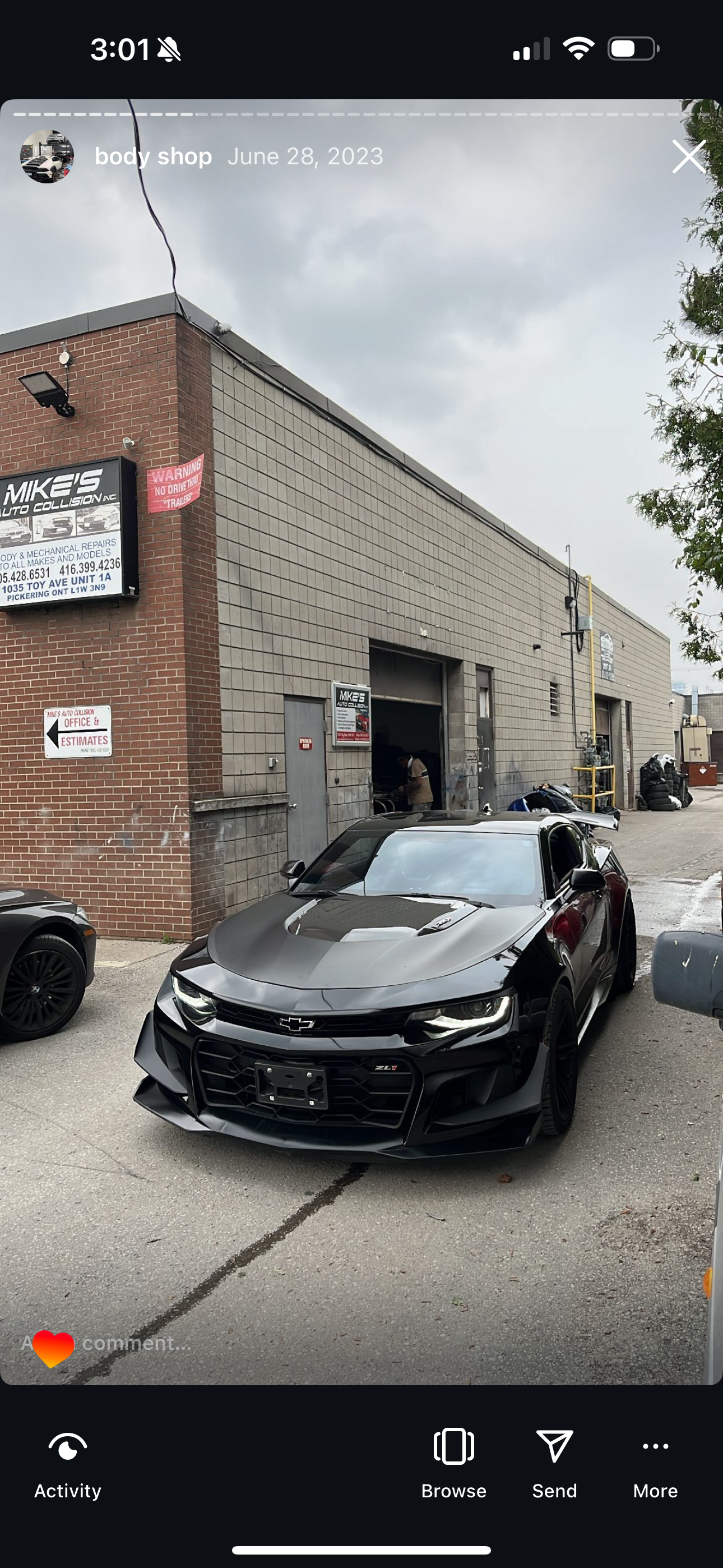 A black Chevrolet Camaro ZL1 sports car parked outside an auto repair shop on a cloudy day. The shop has a brick and gray exterior with signs for the business named Mike's Auto Collision.