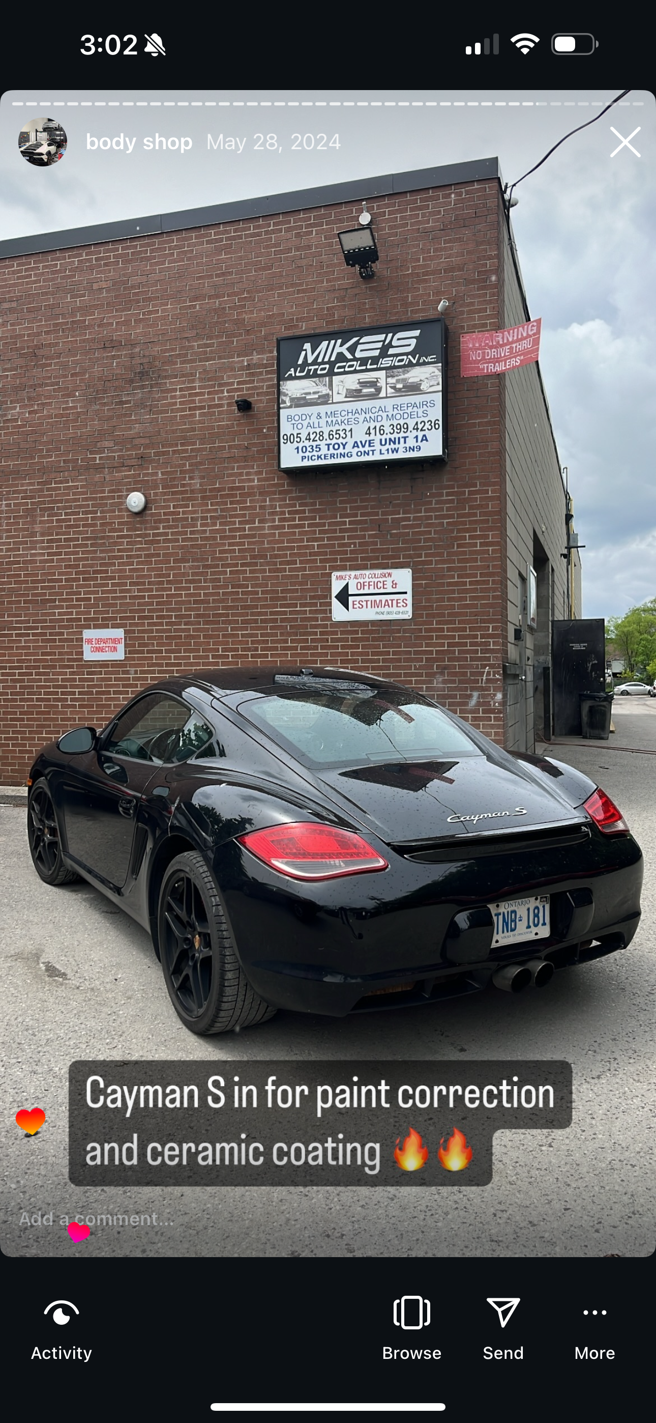 A black Porsche Cayman S parked outside a body shop building, with signs indicating auto body repairs and estimates. The caption mentions the car is in for paint correction and ceramic coating.