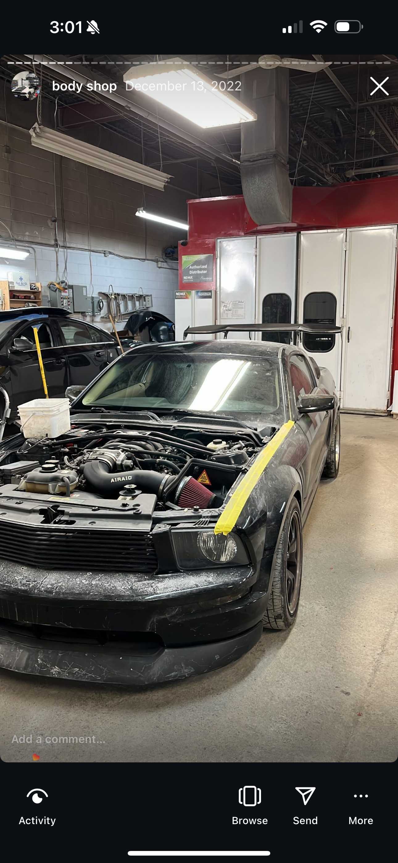 A black sports car with an open hood in a garage or workshop, with some parts removed or uncovered, and yellow tape on the front corner. Another black car is visible to the left, and various equipment and shelves are in the background.