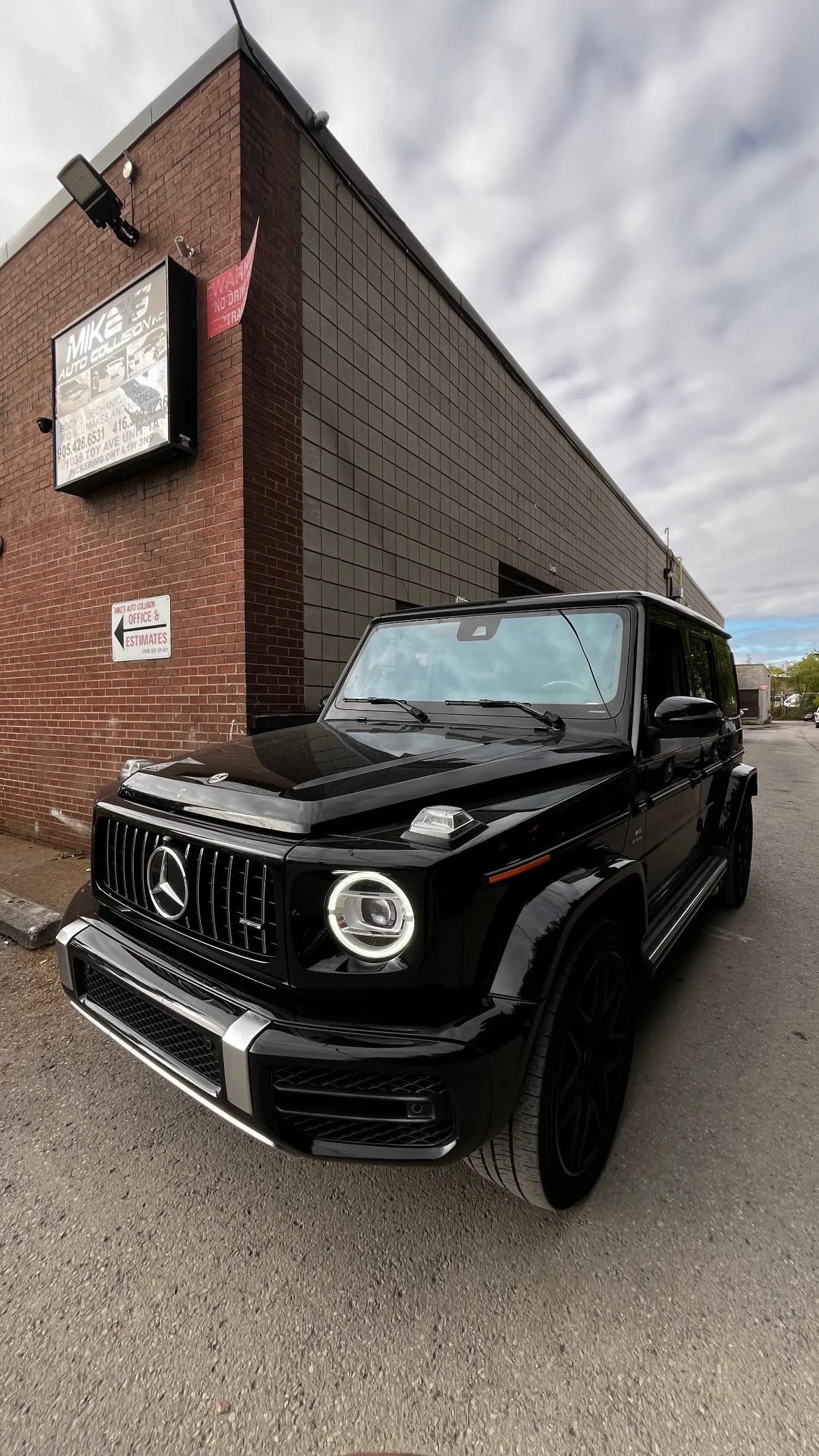 Black Mercedes-Benz G-Class SUV parked outside a brick building with a sign for Mike's Auto Collision.