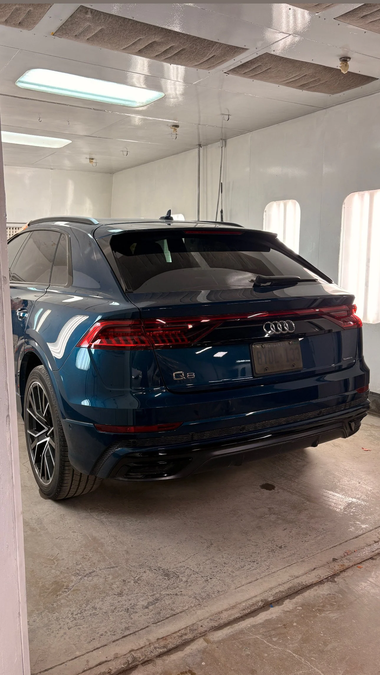Blue Audi Q8 SUV parked inside a garage with white walls and ceiling, fluorescent lights, and windows along the side wall.