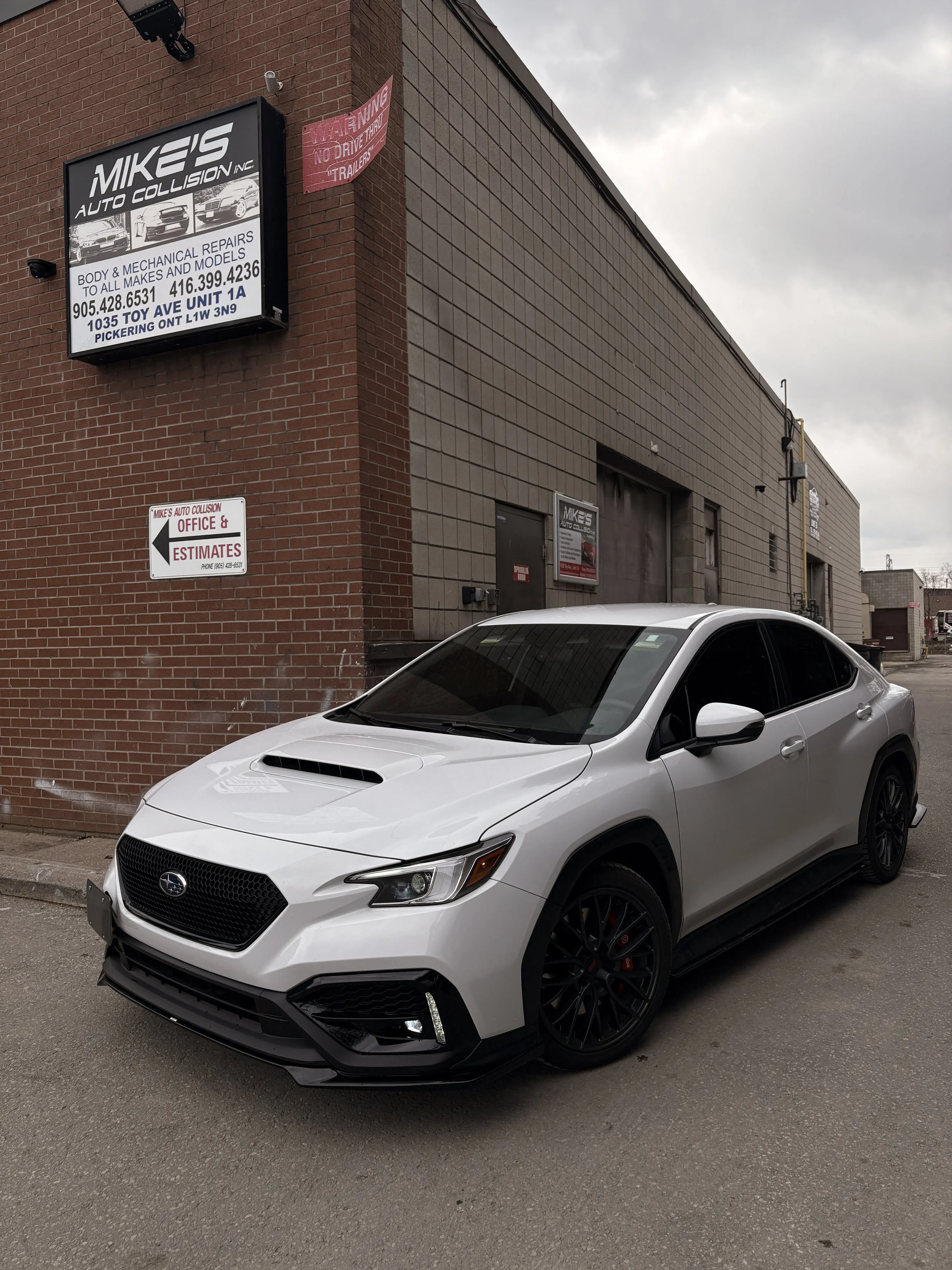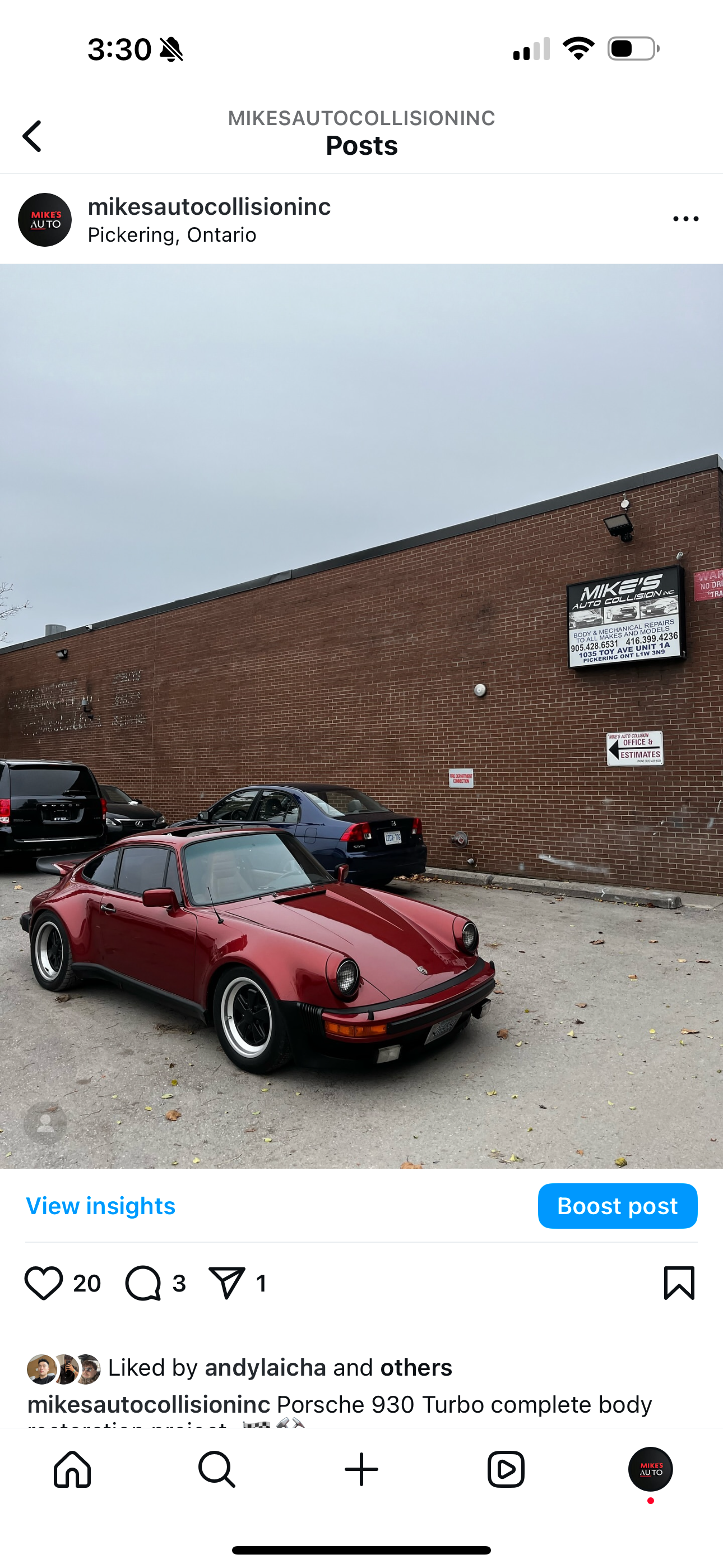 Red Porsche 930 Turbo parked in front of an auto repair shop with a brick wall, other parked cars, and signage for Mike's Auto Collision in Pickering, Ontario.