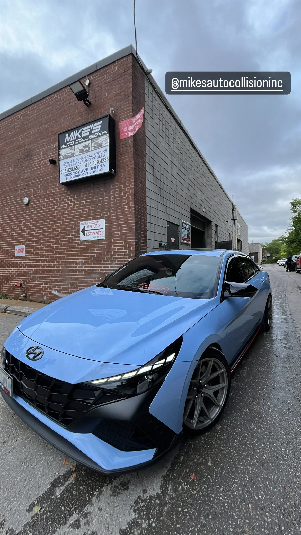Blue Hyundai sports car parked outside an auto collision repair shop building with signs and dark clouds above.