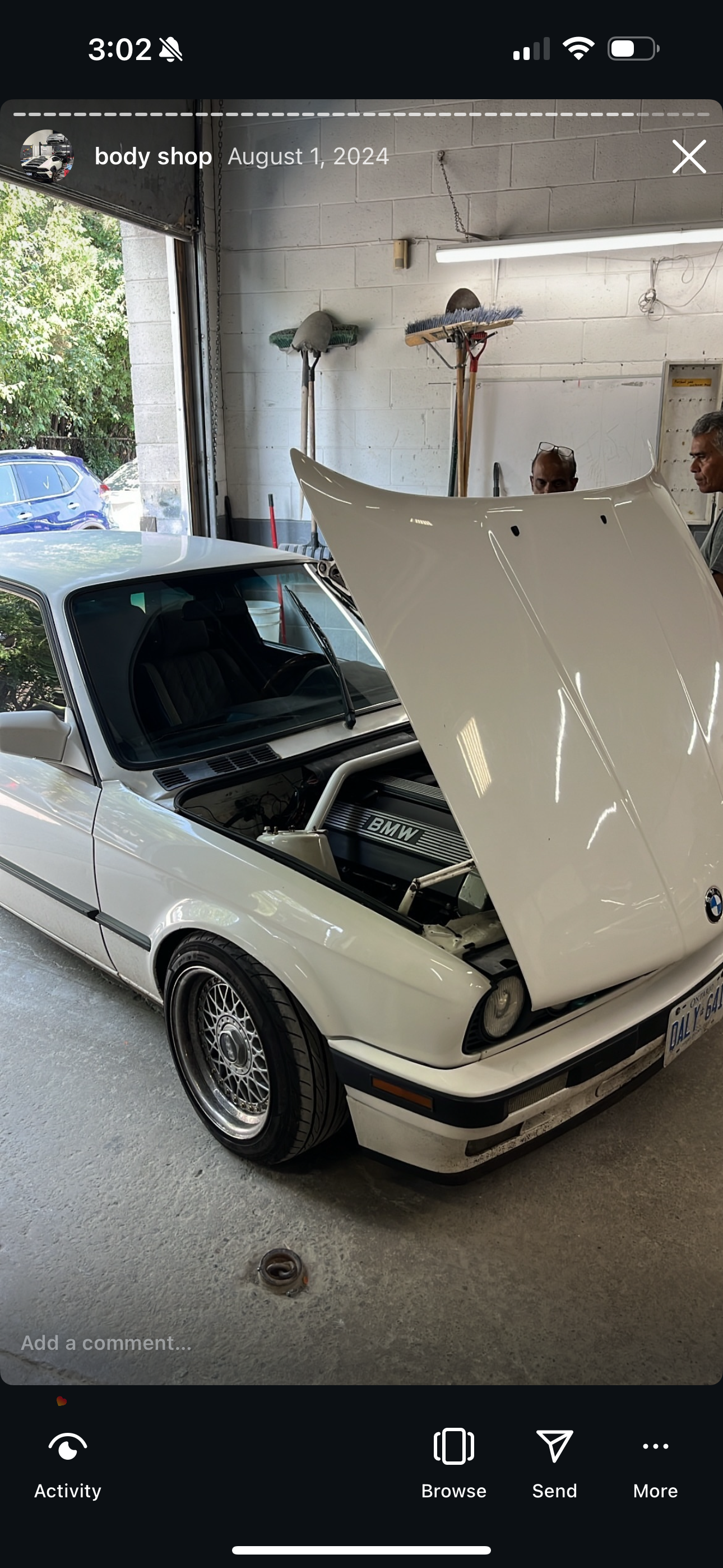 A white vintage BMW car with its hood open inside a garage, revealing the engine. Two men are standing near the car, engaged in a discussion. The garage has cleaning tools hanging on the wall and sunlight coming in through an open door.