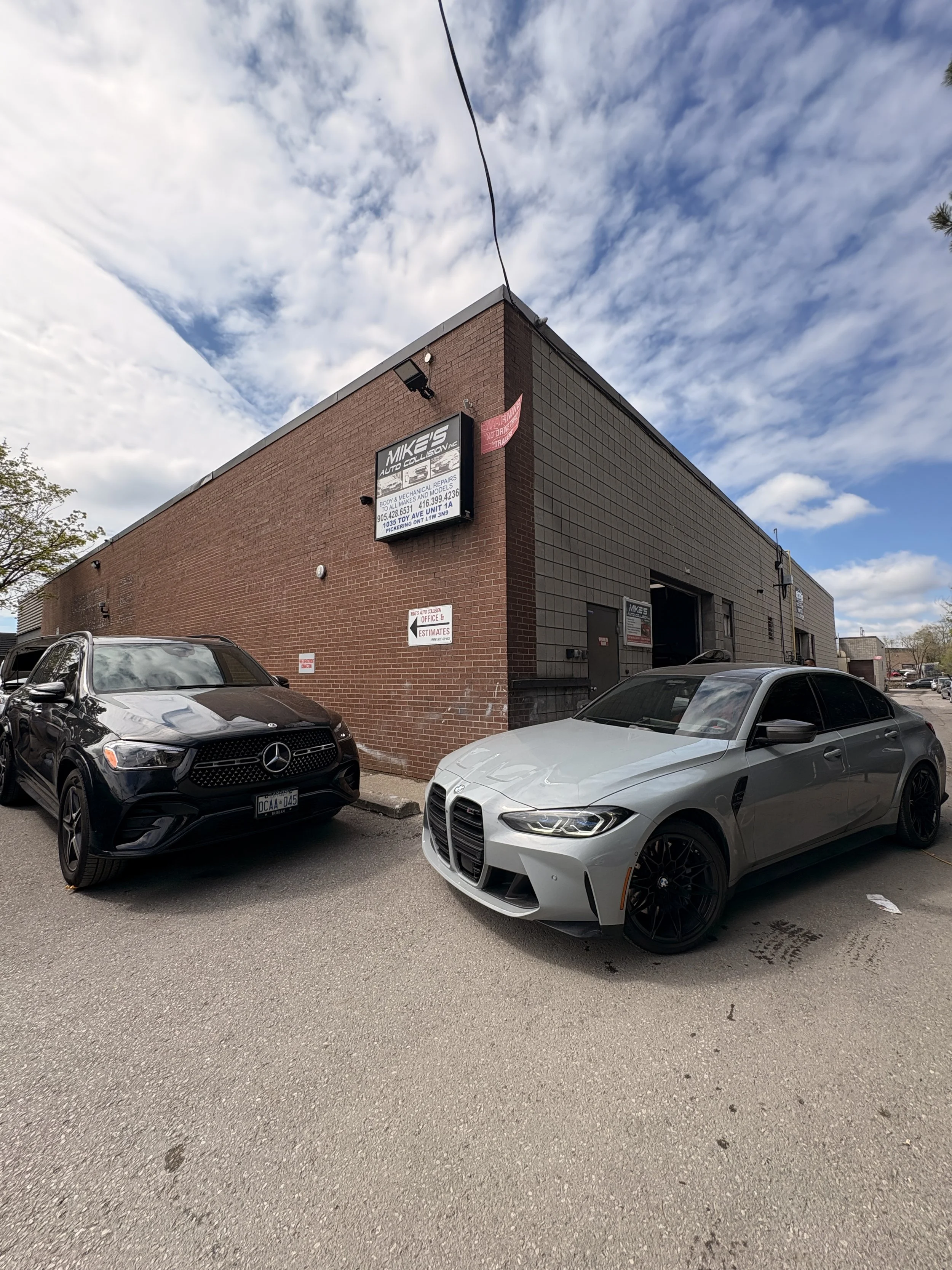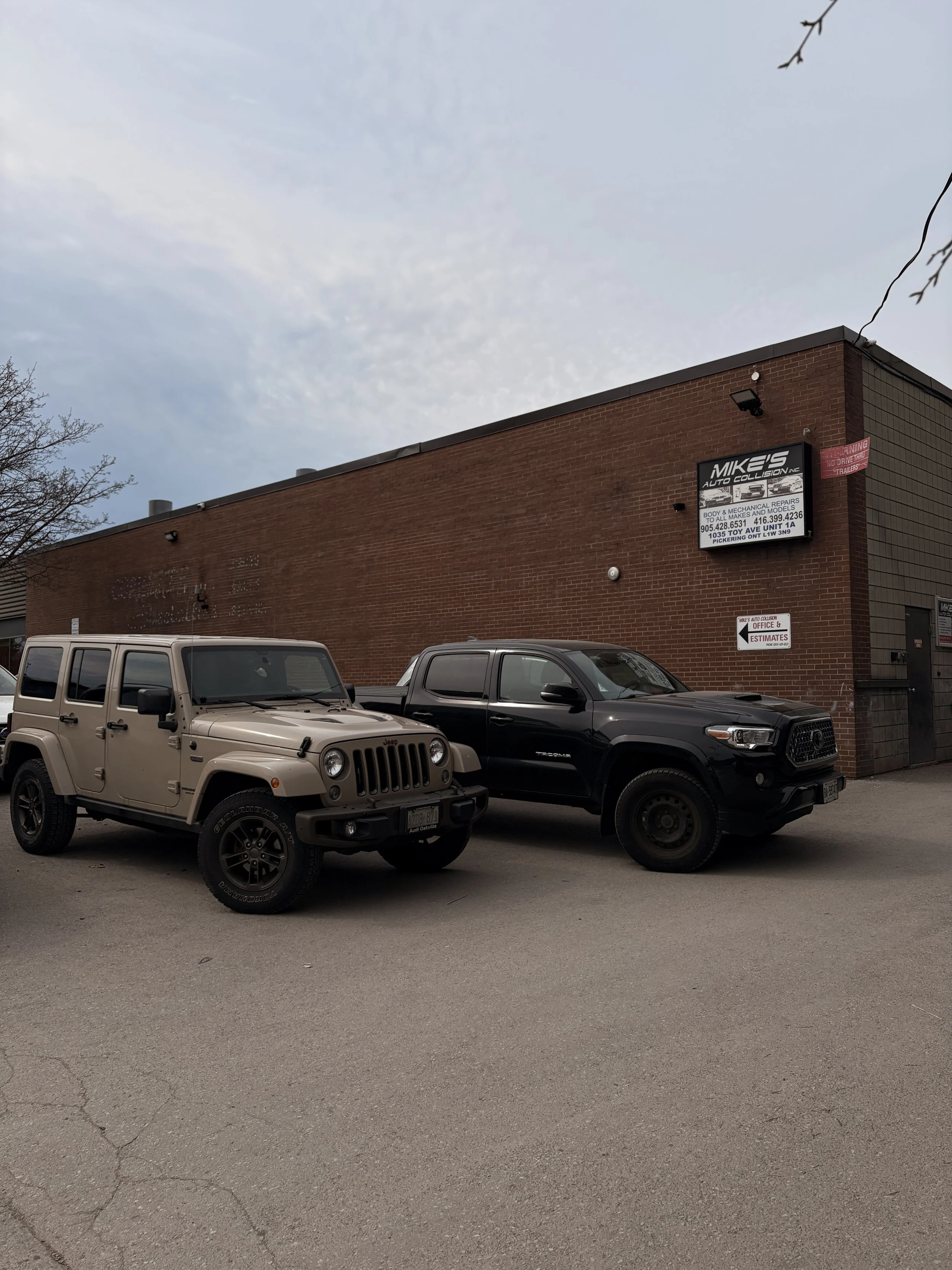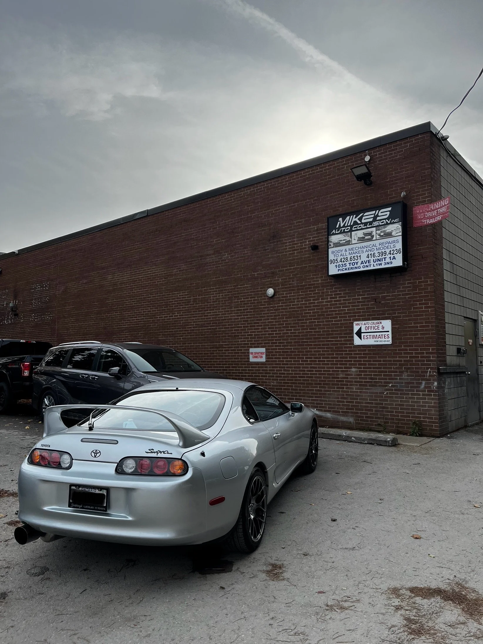 A silver Toyota Supra parked in front of a red brick building with a sign for Mike's Auto Collision, an auto repair shop, on a cloudy day.