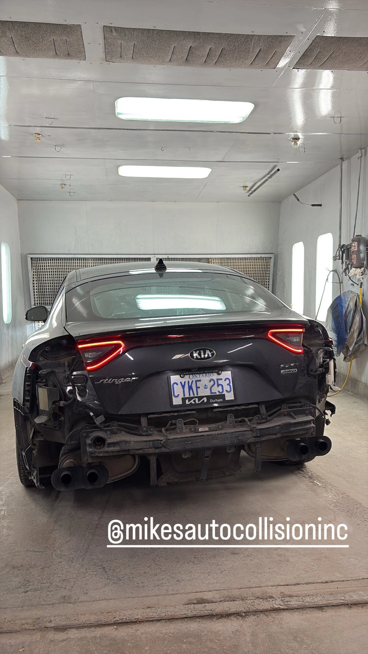 A black Kia Stinger car with the rear bumper removed, inside a spray booth at an auto body repair shop.