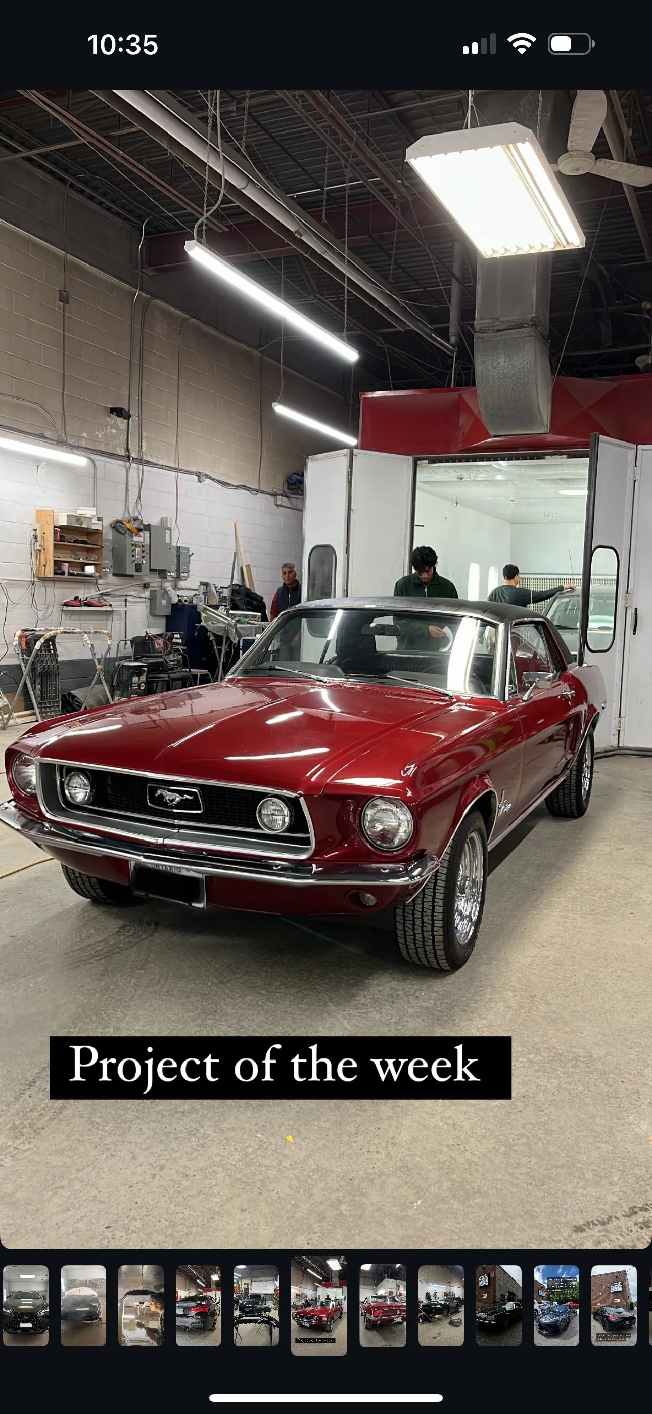 A red vintage Ford Mustang car parked inside a garage with tools and equipment, labeled as 'Project of the week'.