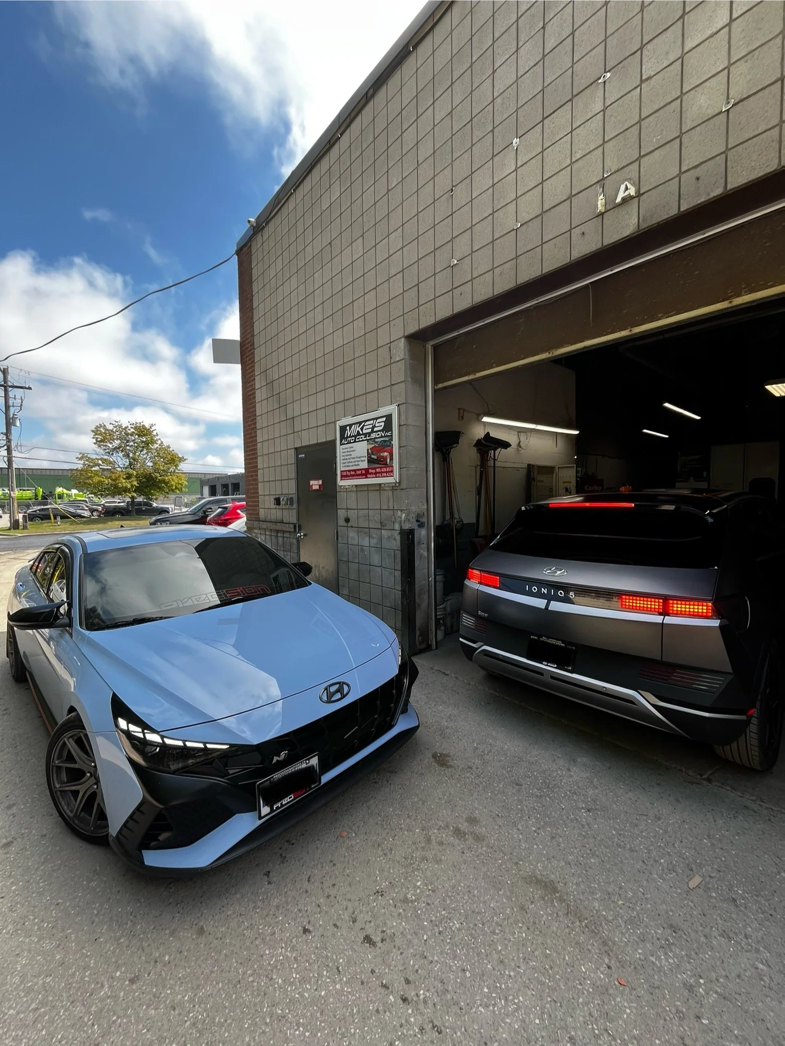 Blue Hyundai sports car parked outside auto repair shop, black Hyundai Ioniq 5 inside garage, building with beige tiles, sign on wall, partly cloudy sky.