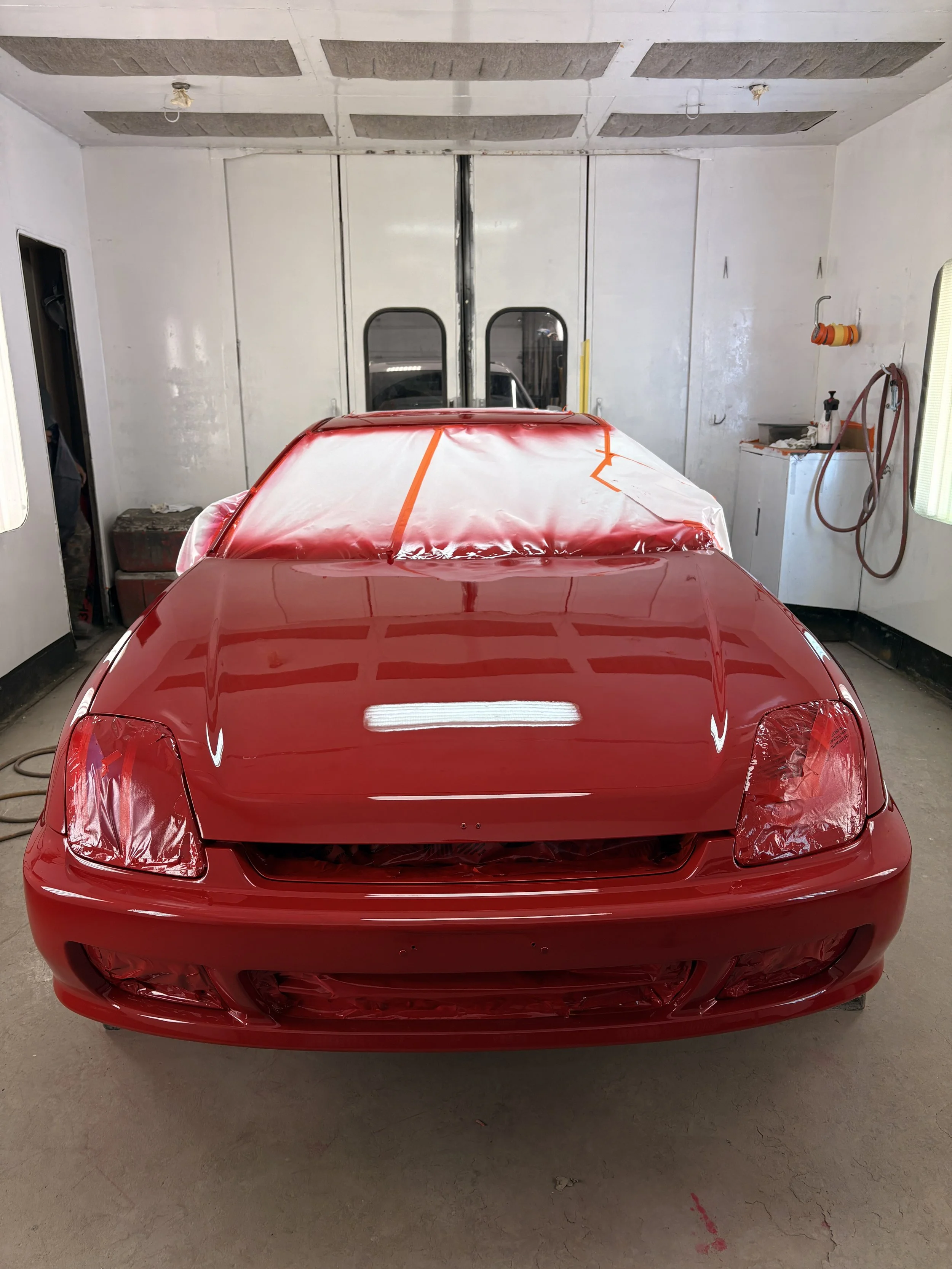 Red car being painted in a garage with masking tape and plastic covering on the hood and windshield.