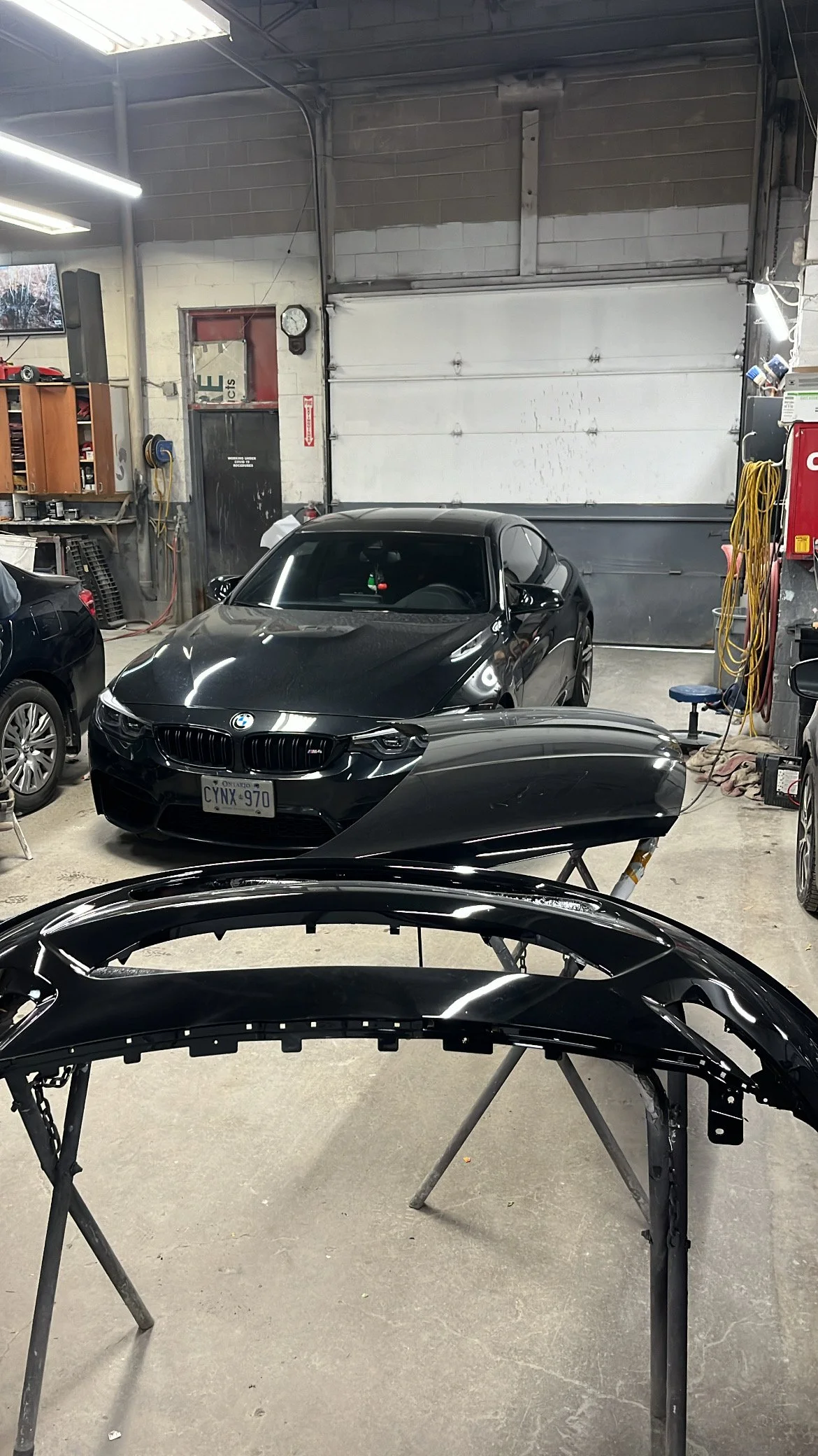 A garage with a black BMW car and front bumper, workbench with tools, and a closed garage door.