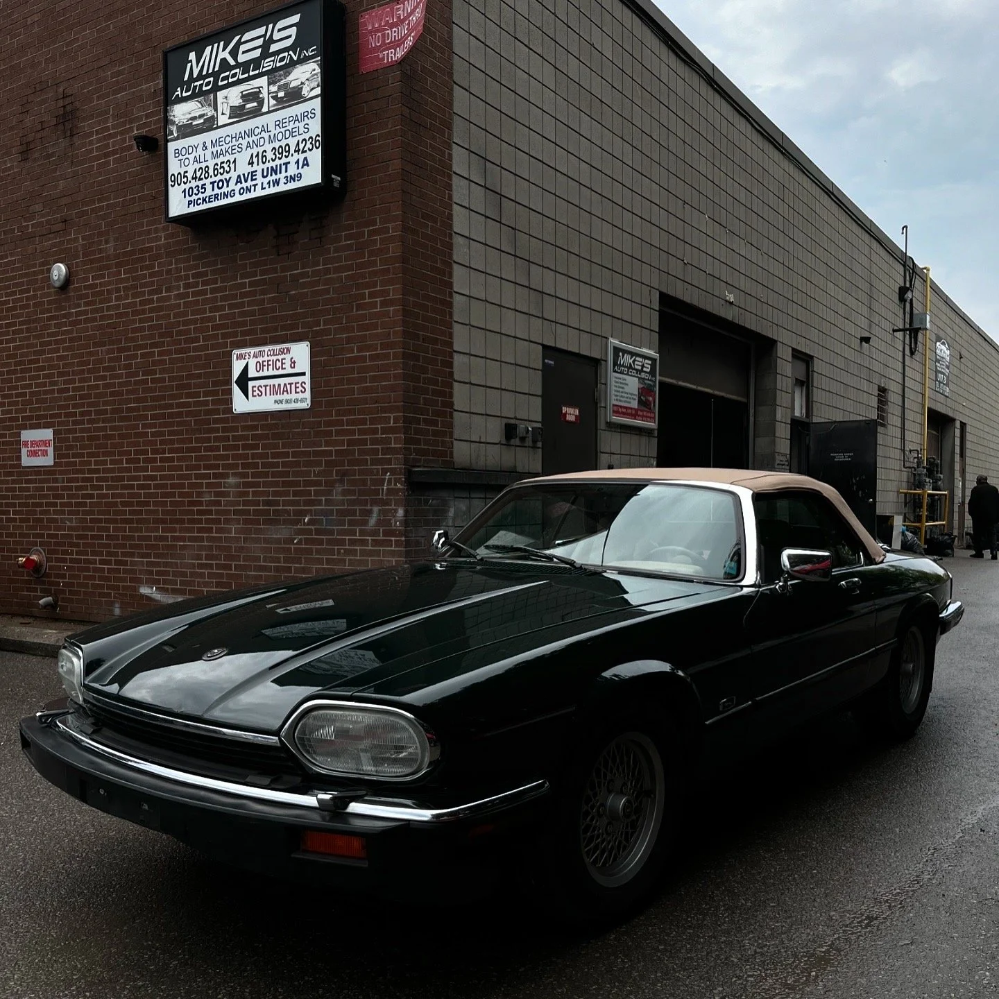 Black vintage convertible car parked outside a building with signs for Mike's Auto Collision, showing a white roof, shiny black body, and wire wheels.
