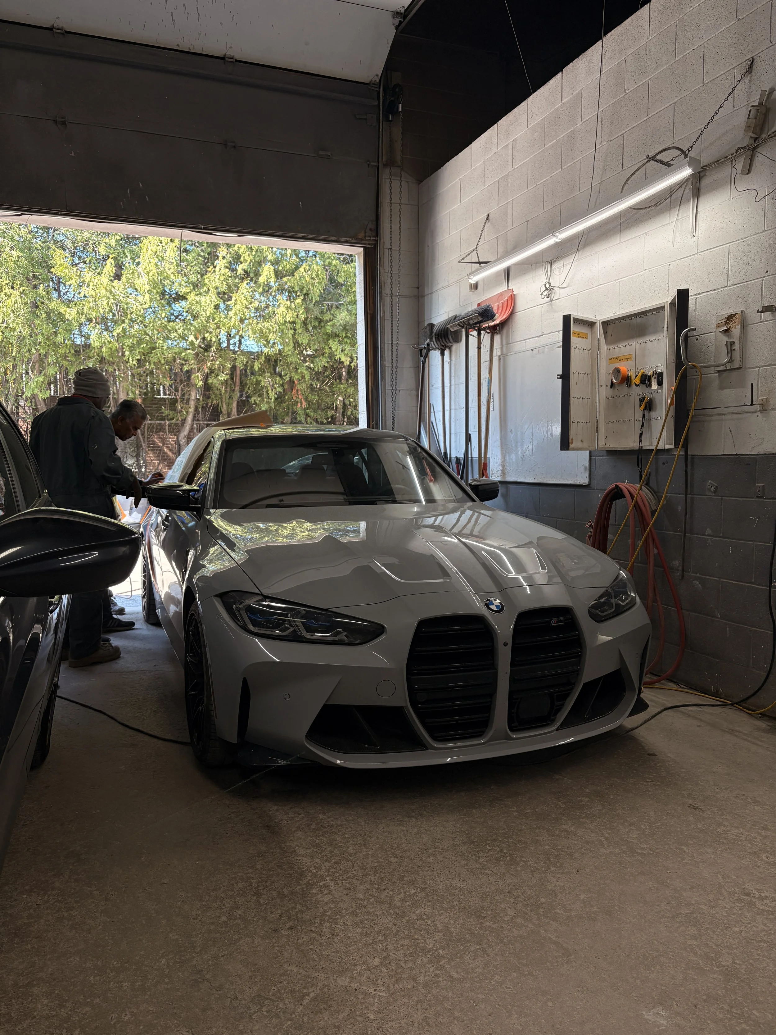 Silver BMW sports car inside an auto repair shop garage with two people working near the driver side. There's a large open door with a view of trees outside, and tools hanging on the wall.